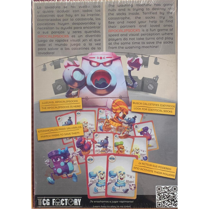 Apocalipsocks es un divertido y alocado juego de cartas de Montse Mkd ilustrado por el famoso dibujante Michel Verdu que te hará partirte de risa mientras juegas. Trata de buscar parejas de calcetines mientras giras sobre ti mismo como el programa de centrifugado de la lavadora, o mientras te conviertes en dos pinzas de la ropa y tienes que ir tendiendo a tus compañeros de juego… ¡o mientras te tapas un ojo con una mano!