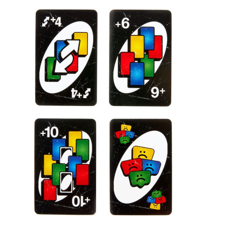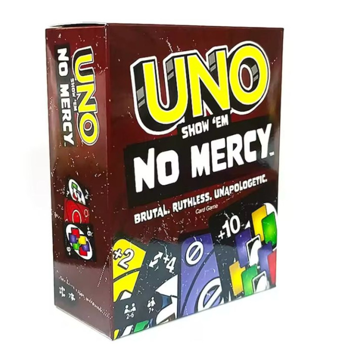 UNO Show 'Em No Mercy es una versión brutal y despiadada del clásico juego de cartas UNO. Además de las cartas de acción estándar como Saltar, Invertir y Robar 2, No Mercy viene con Wild Draw 6, Wild Draw 10, Skip Everyone, Discard All y la nueva Wild Color Roulette, una carta que obliga al siguiente jugador a elegir un color y luego robar hasta conseguir una carta de ese color.