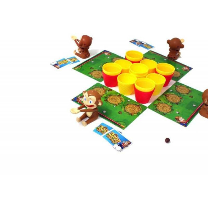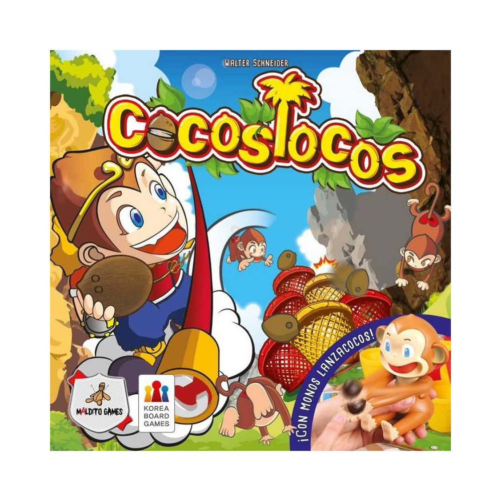 En Cocos Locos, un juego familiar de destreza basado en el Rey Mono (un personaje de la mitología china), los jugadores lanzan cocos hacia un campo cubierto de cestas en el centro de la mesa. Acierta en una cesta, y podrás apilarla en tu tablero de jugador; acierta en la cesta del tablero de otro jugador y podrás moverla al tuyo.